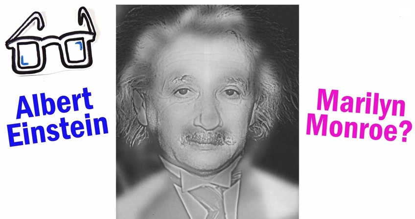 Chi possiede una vista normale vedrà dunque Albert Einstein, chi invece ha qualche problema di vista vedrà Merilyn Monroe. Questo perchè un’immagine sfuocata dell’attrice si sovrappone quella più marcata dello scienziato, infatti allontanandovi dalla foto, anche chi vede bene, noterà che non vedrà più l’uomo della teoria della relatività, bensì la stella hollywoodiana.