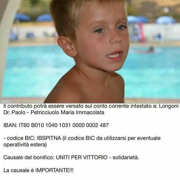 Ora è il momento di passare all’azione e sostenere economicamente Vittorio. Invitiamo tutti i nostri lettori a effettuare un versamento, anche piccolo, rinunciando, per una volta, ad una cena fuori casa, un vestito o a un giocattolo in più per i nostri figli affinché Vittorio possa sostenere le spese del viaggio e delle cure necessarie. Uniti per Vittorio e sostegno a tutti i bambini che soffrono di patologie tumorali.