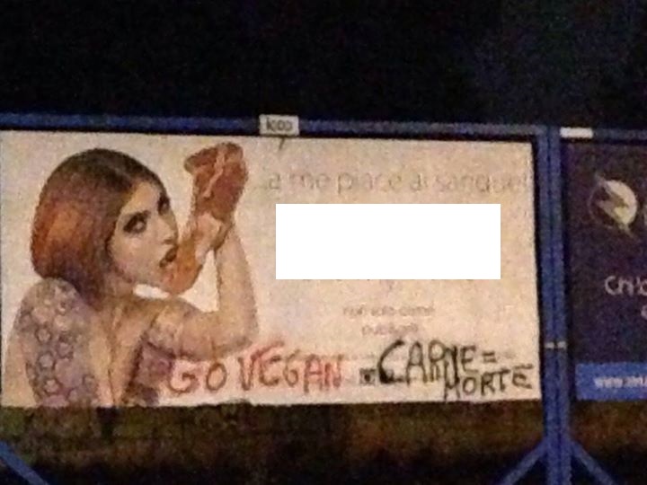 Evidentemente non si è fermata alle pagine di facebook la protesta dei giorni scorsi contro la grilleria colpevole di aver utilizzato la pubblicità “della vergogna”, in cui viene immortalata una vampira intenta ad addentare una fetta di carne, presumibilmente cruda. Anzi, è la stessa direzione del locale ad asserire con tanto di foto, come si sia passati dalle parole ai fatti, imbrattandolo quel manifesto con la frase “carne=morte”. E lasciandoci anche la firma “Go vegan”.