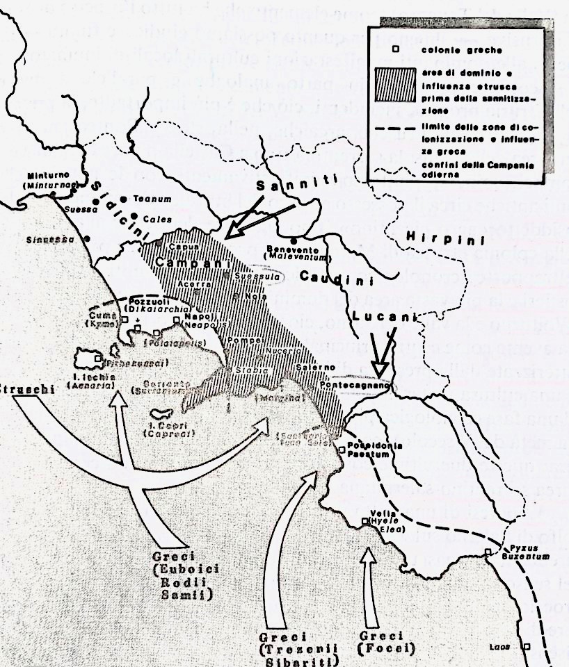 Gli Etruschi sono stati fondamentali in Campania. La Campania è stata culla di una propaggine della cultura e della popolazione etrusca, che si installò nella regione all’incirca attorno all’VII secolo a.C. (prima di tale data avremo comunque la cultura villanoviana, ovvero il nucleo culturale protoetrusco che darà vita poi al popolo etrusco). Questo non fu un caso di poco conto, bensì questo enclave fu tanto autonomo da dar vita al fenomeno che in letteratura viene chiamato “Etruria Campana”, proprio per far intendere l’autonomia di questo nucleo dall’Etruria propria, ovvero quella della Toscana. Questa presenza fu portatrice di benessere, sviluppo tecnologico e sociale, dando l’avvio al processo di evoluzione che farà trovare fertile terreno alla successiva evoluzione. Basti citare i principali centri della Campania: Sorrento, Nocera, Nola, Acerra, Pompei, Capua per conoscere comuni origini etrusche. Anche Napoli, nonostante fosse una colonia greca, aveva floridi contatti con il popolo etrusco. Insomma gli Etruschi, in collaborazione coi Greci, hanno fatto grande sin dall’antichità la nostra regione.