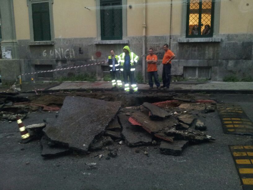 Un “buco” che pare continui ad ampliarsi: a provocarlo potrebbe essere stata la rottura di una conduttura idrica. Le infiltrazioni d’acqua avrebbero provocato il cedimento del manto stradale, causando anche problemi alla rete elettrica. La strada è stata completamente chiusa al traffico e due palazzine sono state evacuate, mentre i vigili del fuoco sono al lavoro per cercare di capire l’origine della voragine e porre rimedio. Un’0perazione che però potrebbe risultare più complessa del previsto.