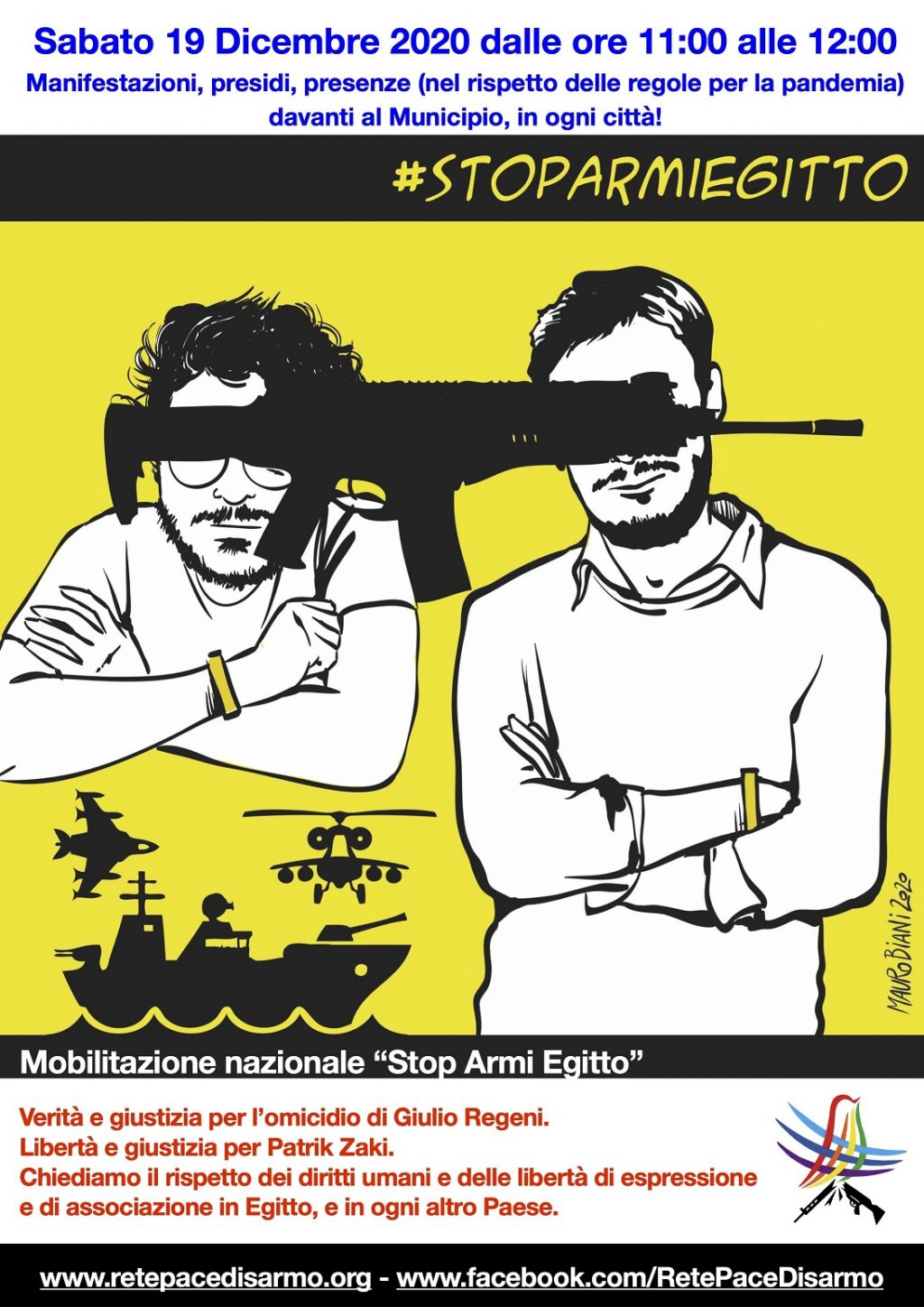 Dopo aver diffuso, a pochi giorni dalla chiusura delle indagini sul caso Regeni, la richiesta al Governo di richiamo dell’Ambasciatore italiano dall’Egitto, di una forte azione di pressione sulle autorità egiziane e la cancellazione degli accordi di cooperazione e vendita di armi con il regime di al-Sisi la Rete Italiana Pace e Disarmo ha deciso di indire una mobilitazione simbolica nazionale per sabato 19 dicembre 2020.