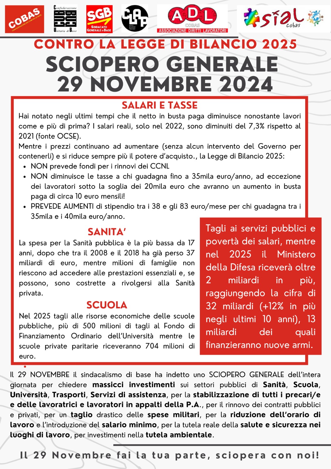Il 29 novembre, i COBAS, insieme agli altri sindacati conflittuali ADL, Clap, Sial, hanno proclamato lo sciopero generale dei lavoratori/trici di tutti i settori privati e pubblici, per l’intera giornata, contro le politiche economiche e sociali del governo Meloni. Le richieste principali dei COBAS riguardano massicci investimenti nei settori pubblici di Sanità, Scuola, Università, Trasporti, Servizi di assistenza e il taglio drastico delle spese militari; la stabilizzazione di tutti i precari/e e dei lavoratori/trici in appalto della P.A.; Il rinnovo dei contratti pubblici e privati con aumenti salariali che recuperino totalmente l’inflazione reale; l’adeguamento delle pensioni alla inflazione e l’abolizione della legge Fornero; la riduzione dell’orario di lavoro e l’introduzione per legge del salario minimo; la tutela reale della salute e sicurezza nei luoghi di lavoro; significativi investimenti per la protezione dell’ambiente e il risanamento dei territori; la libertà di movimento, i diritti di cittadinanza e l’abolizione della Bossi Fini.