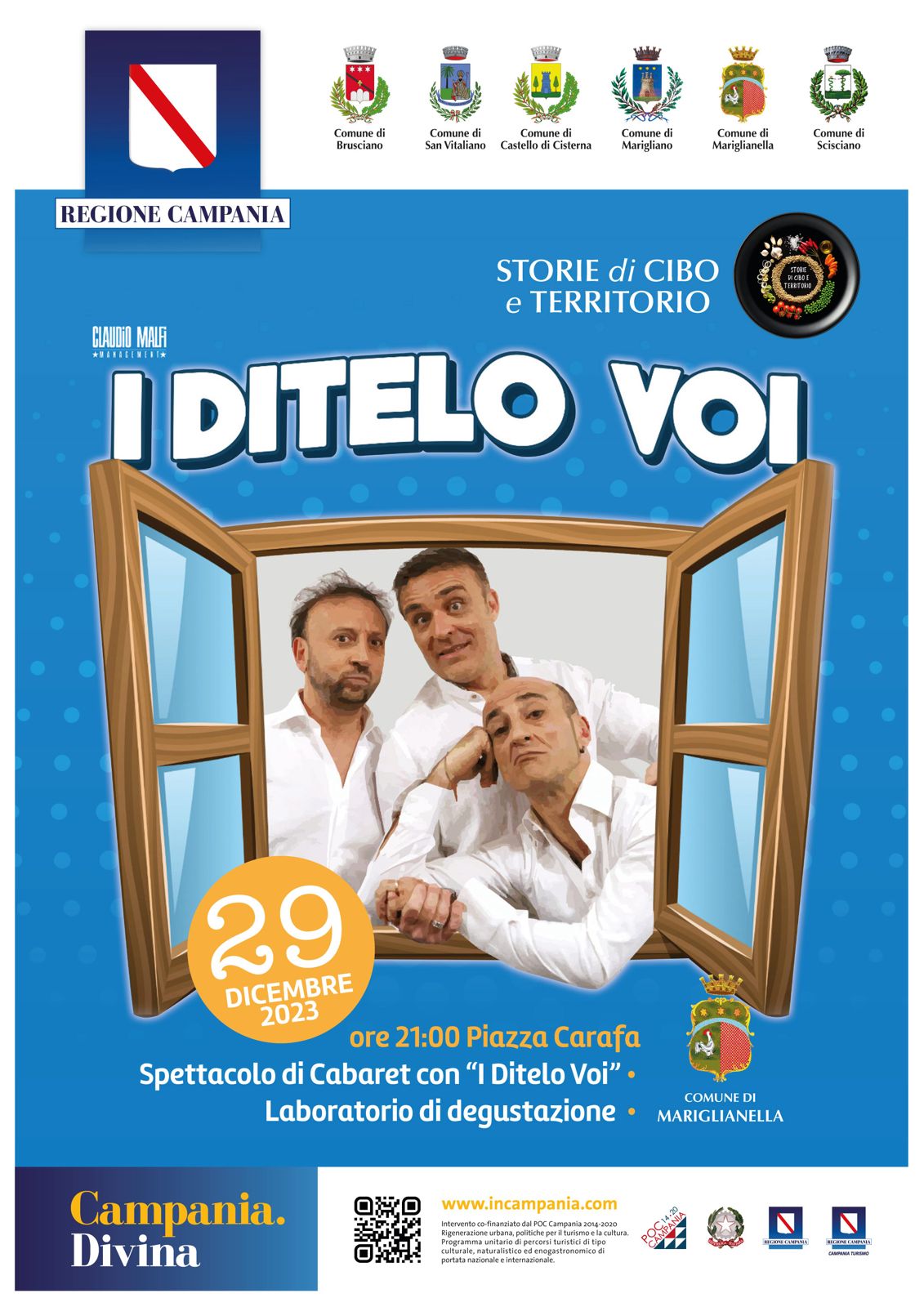 Prosegue l’itinerario tra i comuni dell’Agro-Nolano delineato dal progetto “Storie di Cibo e Territorio”, dedicato alla riscoperta, anche in chiave di potenziale attrazione turistica, delle eccellenze gastronomiche e delle produzioni tipiche dei comuni di Brusciano, Castello di Cisterna, Marigliano, Mariglianella, San Vitaliano e Scisciano. La nuova tappa sarà ospitata il 29 dicembre, a partire dalle ore 21.00, presso il Comune di Mariglianella, in Piazza Carafa. Protagonisti, questa volta, saranno i prodotti dell’orto, utilizzati come ingrediente principale del piatto che sarà offerto presso il laboratorio i degustazione allestito per l’occasione. Abbinato alla degustazione non mancherà un momento di spettacolo e piacevole intrattenimento comico con il Cabaret del noto gruppo comico “I Ditelo Voi”, che si esibiranno presso la stessa location. Un altro imperdibile appuntamento, dunque, all’insegna del gusto e del divertimento. Il progetto gode del co-finanziamento da parte del POC Campania 2014-2020. Rigenerazione urbana, politiche per il turismo e la cultura. Programma unitario di percorsi turistici di tipo culturale, naturalistico ed enogastronomico di portata nazionale e internazionale.
