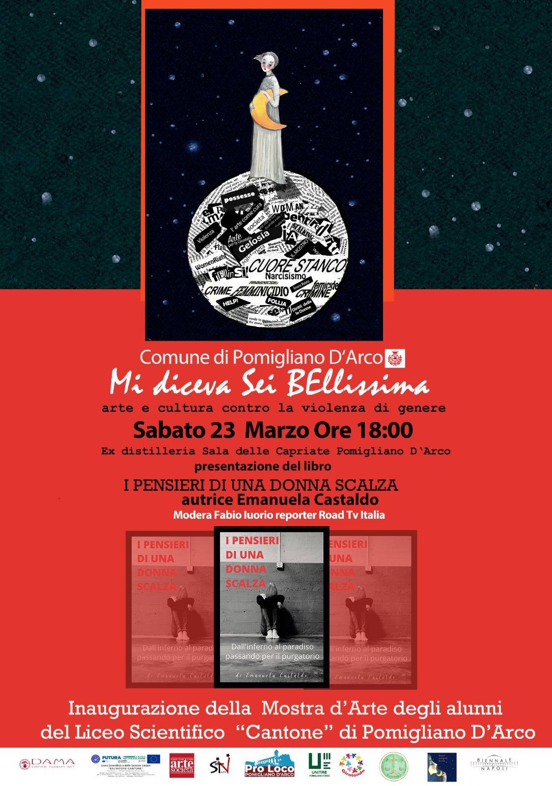 Emanuela Castaldo, 46 anni napoletana, racconta nel libro “I pensieri di una donna scalza”, che definisce una terapia, le violenze subite dopo il matrimonio, per sedici anni, fino a quando non trova la forza di chiedere aiuto, assieme ai tre figli scappare di casa e denunciare. Con l’autrice, sabato 23 marzo alle 18, nella sala delle Capriate di Pomigliano d’Arco, ne discute Elvira Romano, assessore alle Pari opportunità di Pomigliano d’Arco. Modera Fabio Iuorio, reporter RoadTv Italia.