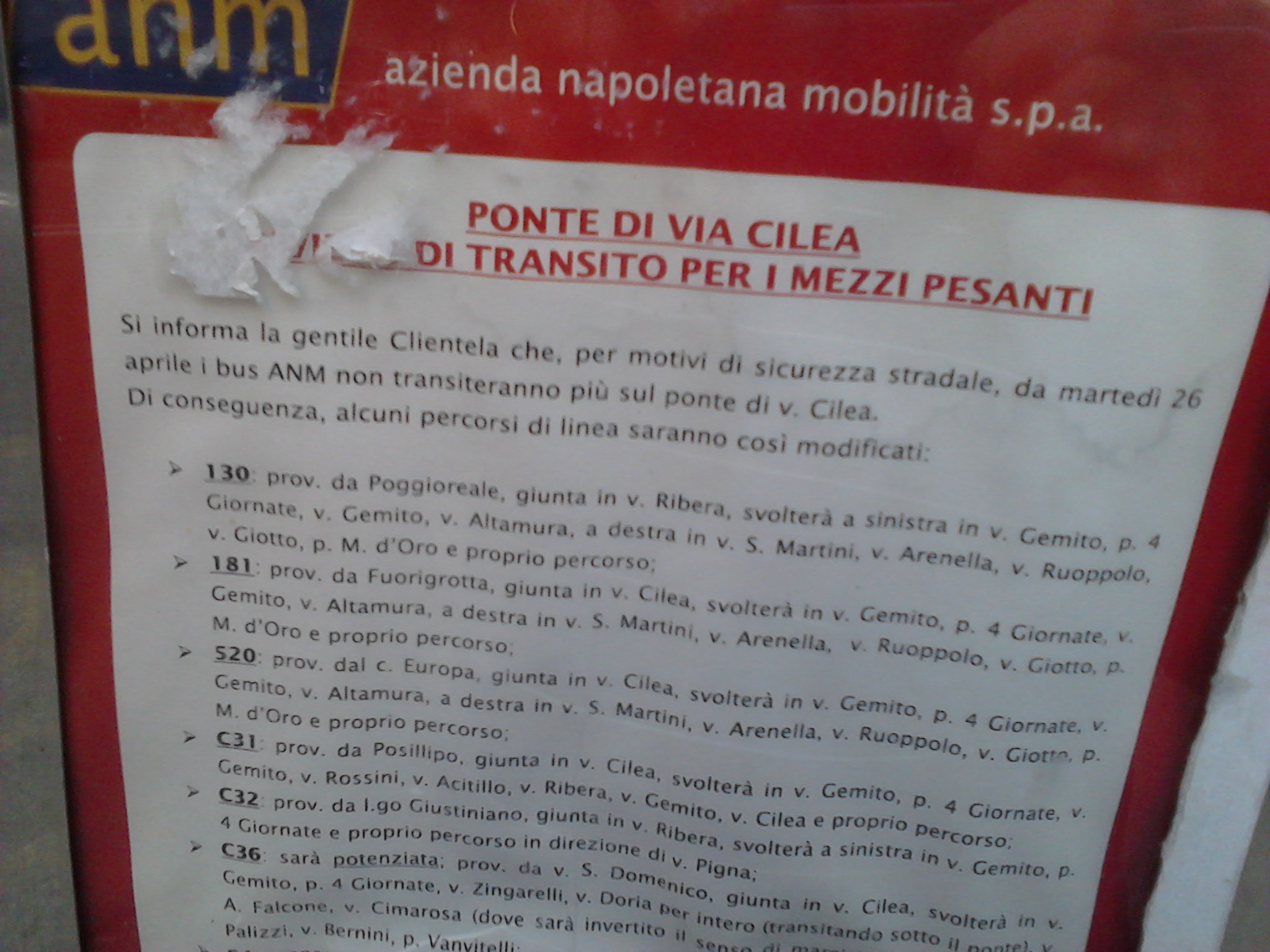 Il 26 settembre sono cinque mesi che il Ponte di Via Cilea è inibito ai mezzi pubblici (anche se i mezzi pesanti privati continuano a passarci indisturbati) e ancora non si vede l’inizio dei lavori. Assoutenti Napoli continua imperterrita a segnalare la situazione alle istituzioni cittadine, finora, purtroppo, invano… Sorge un dubbio: avremo forse gli stessi tempi del Ponte sullo Stretto di Messina?