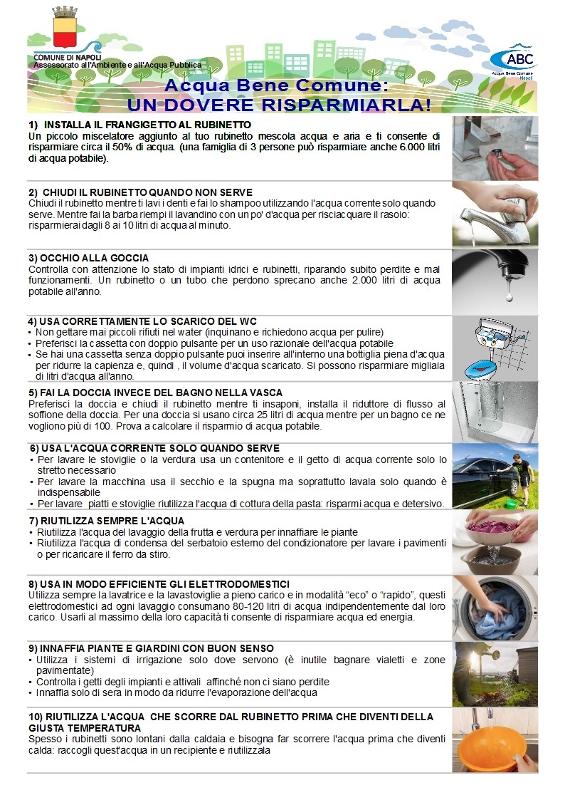 Sul sito ufficiale del Comune di Napoli è stato dal poco pubblicato il decalogo, predisposto dall’assessorato all’ambiente, sull’uso corretto dell’acqua, intitolato ‘Acqua Bene Comune: un dovere risparmiarla’. Sotto potrete vedere le semplici regole da seguire per un corretto uso.