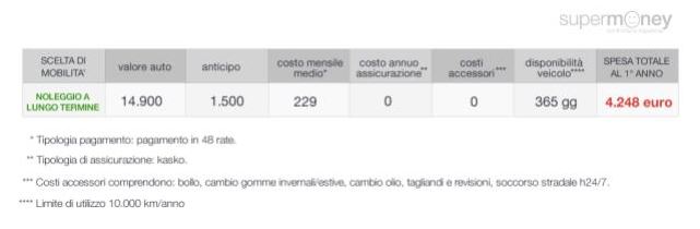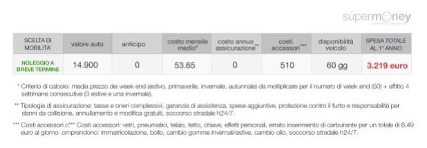 È un ottima soluzione quindi se durante l’anno usi per lo più i mezzi pubblici e ti serve il mezzo solo durante le vacanze o per qualche weekend. Secondo l’analisi di SuperMoney, il costo annuale di questa soluzione è di 3.219 euro, ripartito come segue.