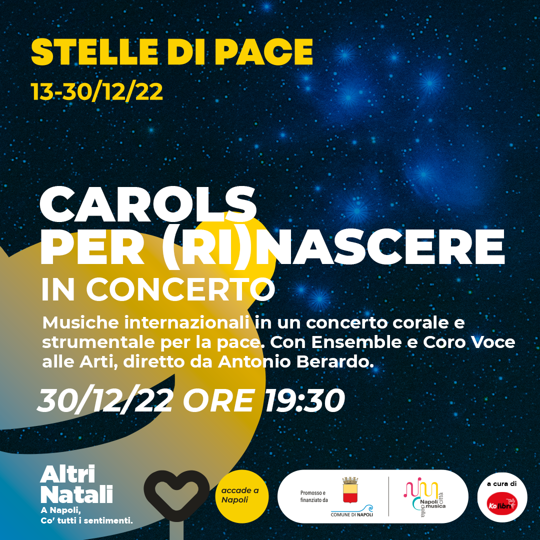 La rassegna “Stelle di pace” prosegue il 28 e 29 dicembre con i Reading e laboratori per bambini per culminare, venerdì 30 dicembre alla presenza del sindaco Gaetano Manfredi, con «Carols per (ri)nascere», musiche internazionali in un concerto corale e strumentale per la pace eseguito dall’Ensemble e Coro Voce alle Arti diretto dal maestro Antonio Berardo (ore 19,30 Basilica di Santa Maria del Carmine Maggiore, piazza del Carmine 2: ingresso gratuito).