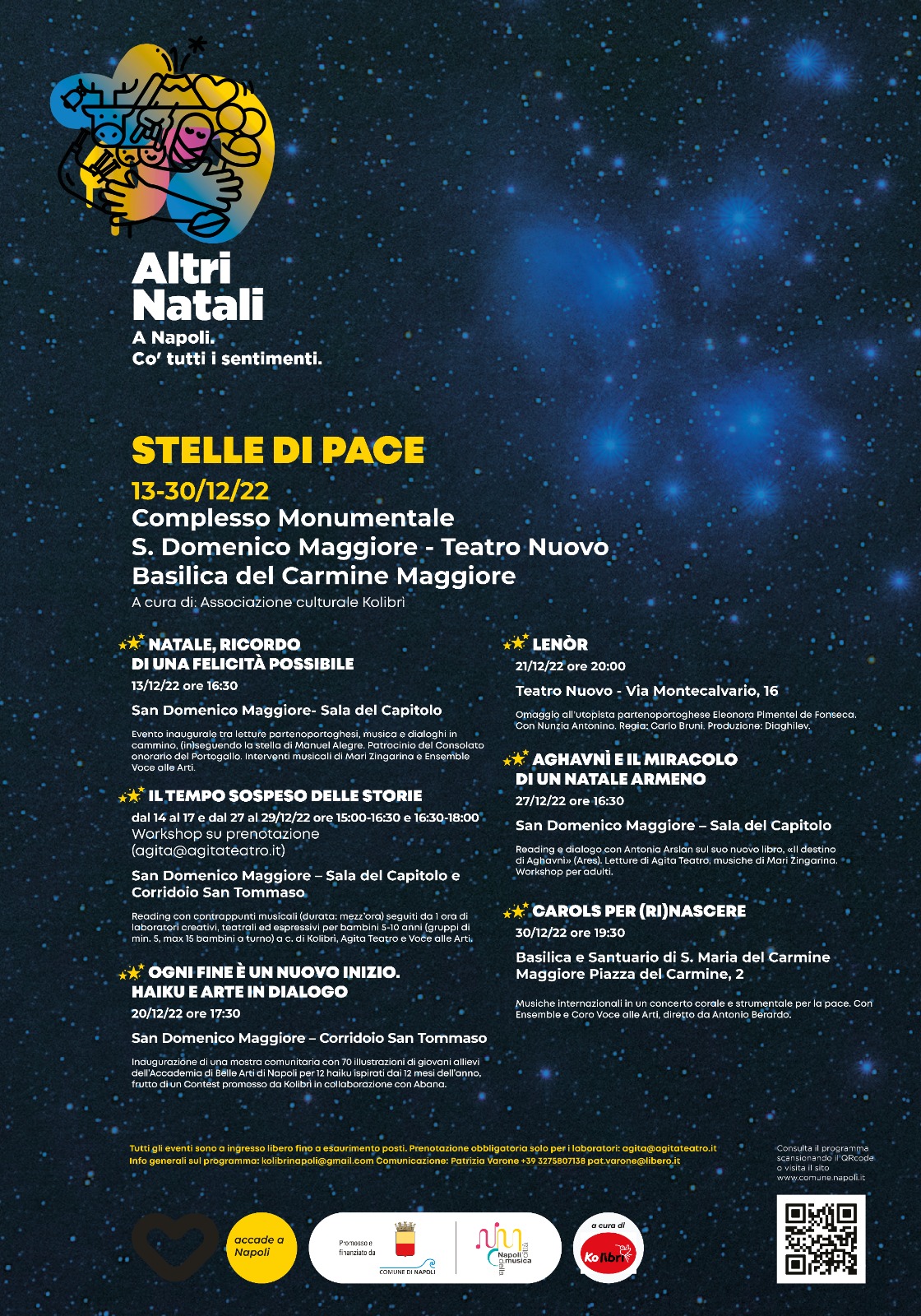 Continua con questo speciale appuntamento la costellazione di eventi della rassegna natalizia “Stelle di Pace” di Kolibrì (reading in contrappunto musicale, laboratori per bambini e adulti, mostre, concerti e spettacoli, realizzati in sodalizio con Agita Teatro, Voce alle Arti, Accademia Belle Arti Napoli, con il patrocinio del Consolato onorario del Portogallo), promossa e finanziata dal Comune di Napoli nell’ambito del palinsesto “Altri Natali”.