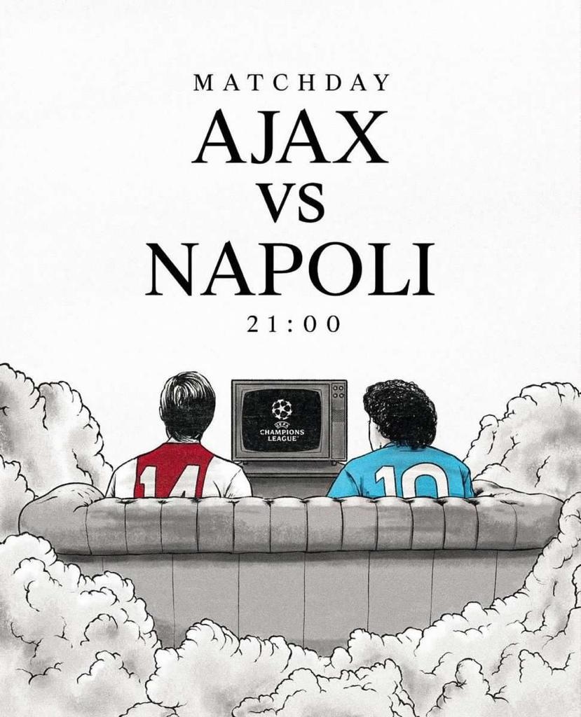 La società olandese ha voluto omaggiare i due campioni con una vignetta che ritrae Cruijff e Maradona davanti a una tv, sul divano tra le nuvole, in attesa del match Ajax-Napoli.
