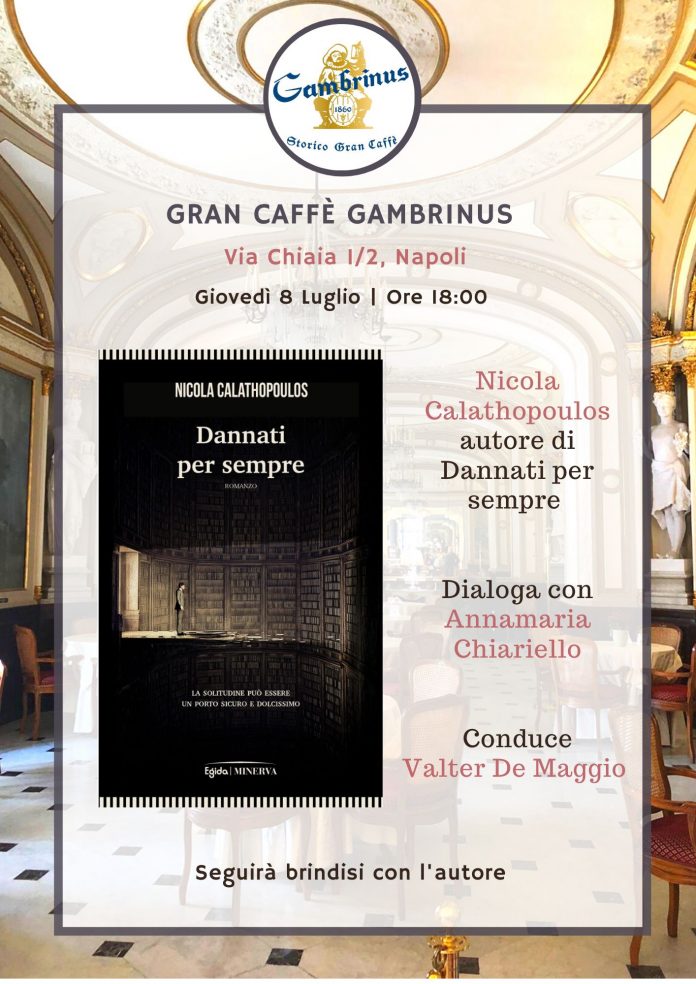 Giovedì 8 luglio 2021 alle ore 18:00, al Gran Caffè Gambrinus si terrà la presentazione del libro “Dannati per sempre” (edizioni MINERVA) di Nicola Calathopoulos (vice – direttore di NewsMediaset). L’autore dialogherà con la giornalista Annamaria Chiariello. La conduzione sarà affidata a Valter De Maggio.