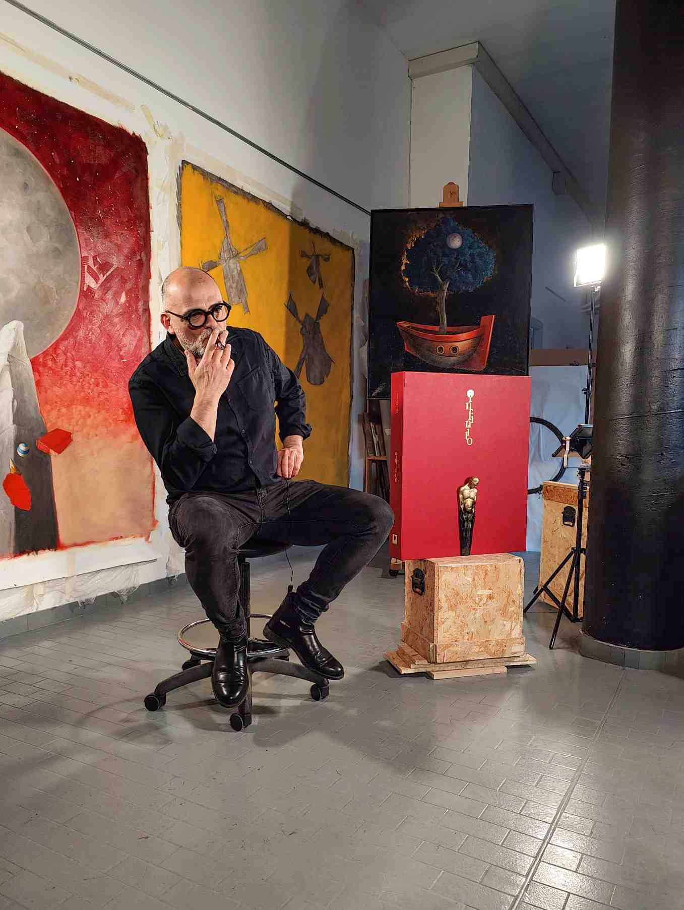 Il maestro torinese, classe 1965, rilegge L’Infinito di Giacomo Leopardi dando vita a un progetto innovativo e ambizioso, non solo in termini di ricerca poetica e pittorica, ma anche nella sua articolazione: 30 opere tra tele dipinte ad olio, tecnica mista su tela e sculture, un libro d’artista a tiratura limitata, un’opera video e due appuntamenti di approfondimento. La celebre lirica viene contemplata attraverso i silenzi metafisici dell’artista e catapultata su palcoscenici in cui gli oggetti presenti sono portatori di simbologie oniriche. L’artista, come il poeta, guarda oltre l’orizzonte per indagare l’inafferrabilità del tempo e l’incommensurabilità dello spazio, mostrando la capacità di approfondire le impressioni immaginifiche che provengono dalla memoria.