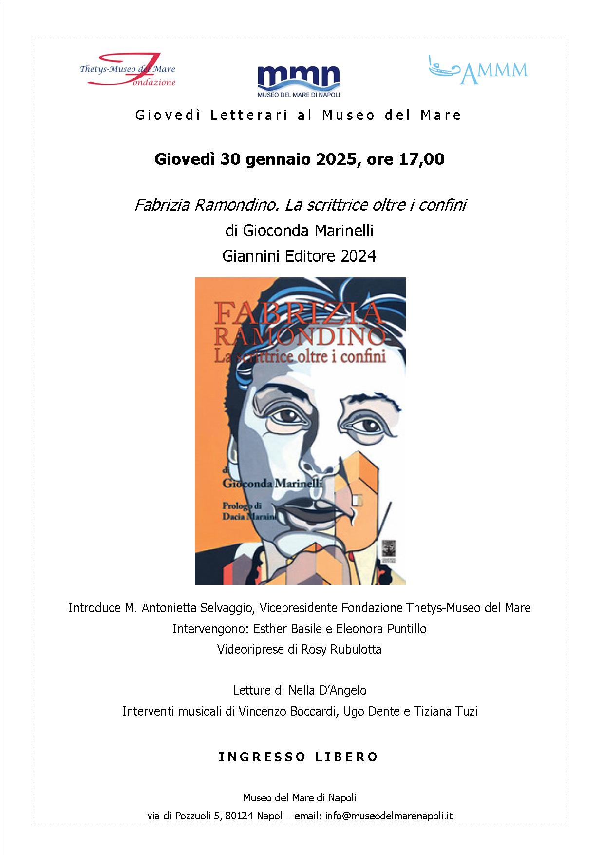 Napoli. Ritorna in libreria, con la Giannini Editore, la scrittrice molisana Gioconda Marinelli che presenterà il suo ultimo libro “Fabrizia Ramondino. La scrittrice oltre i confini”, l’appuntamento è fissato per giovedì 30 gennaio alle ore 17 al Museo del Mare. Introduce Maria Antonietta Selvaggio, vicepresidente fondazione Thetys-Museo del Mare, intervengono: Ester Basile ed Eleonora Puntillo. Le videoriprese saranno a cura di Rosy Rubulotta. Letture a cura di Nella D’Angelo, interventi musicali eseguiti da Vincenzo Boccardi, Ugo Dente e Tiziana Tuzi. L’ingresso è gratuito.