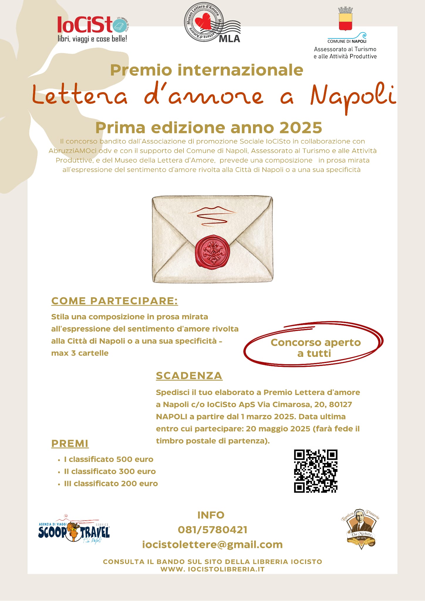 Dopo la conferenza stampa del 14 febbraio, dal 1 marzo sarà finalmente possibile scrivere del proprio amore per la città di Napoli. Parte infatti la prima edizione del premio “lettera d’amore a Napoli” realizzato in collaborazione con AbruzziAMOci che da venticinque anni organizza il Premio “Lettera d’Amore” e gestisce il Museo della Lettera d’Amore, museo unico al mondo, a Torrevecchia Teatina, in Abruzzo e sostenuto dall’Assessorato al turismo e alle attività produttive del Comune di Napoli.