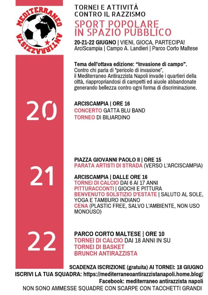 Tema di quest’anno sarà “Invasione di campo”. Contro chi parla di “pericolo di invasione”, la rete cittadina del Mediterraneo Antirazzista Napoli invade i quartieri, riappropriandosi di campetti ed aiuole abbandonate generando aggregazione e bellezza contro ogni forma di discriminazione.