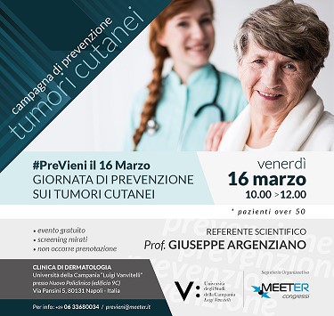 Prevenzione, sensibilizzazione e informazione. Sono questi i temi al centro della campagna #PreVieni, organizzata da Meeter Congressi e patrocinata dall’Azienda Ospedaliera Universitaria e dall’Università della Campania “Luigi Vanvitelli”, che ha come obiettivo la salvaguardia e la salute dei cittadini attraverso la diagnosi precoce del tumore cutaneo e della psoriasi: il 16 e il 23 marzo, l’edificio 9C del Nuovo Policlinico (Via Pansini 5), apre le porte a tutti coloro che desiderano sottoporsi a screening gratuiti mirati ad individuare la presenza delle più comuni patologie che interessano la pelle. Ad accogliere i pazienti un team di esperti della Clinica di Dermatologia – Dr. Alessio Gambardella, Dr.ssa Gabriella Brancaccio e Dr.ssa Teresa Russo – che, guidati dal Prof. Giuseppe Argenziano, offrirà visite specialistiche volte a valutare lo stato di salute del derma.