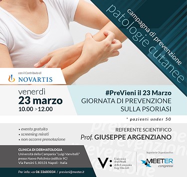 Venerdì 23 marzo, dalle 10 alle 12, tutti i pazienti under 50 potranno sottoporsi allo screening per la diagnosi della psoriasi. L’appuntamento, organizzato grazie al contributo di Novartis, si pone un duplice obiettivo: verificare l’eventuale presenza di patologie e fornire ai pazienti informazioni utili sulle ultime novità scientifiche che anno dopo anno si inseriscono nell’armamentario terapeutico del medico specialista. Secondo i ricercatori in Italia si contano circa due milioni e mezzo di persone affette da psoriasi. Poiché le cause dell’insorgere della patologia non sono ancora del tutto chiare e non esiste una cura definitiva, per molti pazienti questa patologia non è solo un problema dermatologico ma finisce per avere ripercussioni, talvolta anche pesanti, sulla sfera psicologica. Come dichiarato dal team di dermatologi dell’Università della Campania “Luigi Vanvitelli” <<La psoriasi è una patologia infiammatoria della cute a eziologia multifattoriale, generalmente cronica e spesso recidivante, che colpisce circa l’1-2% della popolazione mondiale; nella razza caucasica, la psoriasi colpisce in ugual misura uomini e donne anche se esistono sottotipi della patologia in cui c’è prevalenza di uno dei due sessi. Nelle razze orientali (e in particolar modo nei giapponesi) la malattia interessa maggiormente gli uomini (rapporto 2:1). Le donne, generalmente, sono colpite più precocemente rispetto agli uomini, inoltre i soggetti dalla pelle chiara sono più colpiti rispetto a quelli con cute più scura.>> gli esperti aggiungono << La psoriasi può manifestarsi in qualsiasi fascia di età, ma il problema interessa soprattutto le persone di età adulta; la fascia maggiormente colpita è quella che va dai 10 ai 40 anni e, generalmente il primo attacco si manifesta tra i 15 e i 25 di età.>> Per questa ragione lo screening preventivo, effettuato periodicamente, e la corretta informazione possono migliorare le condizioni di salute del paziente e rallentare il corso della patologia.