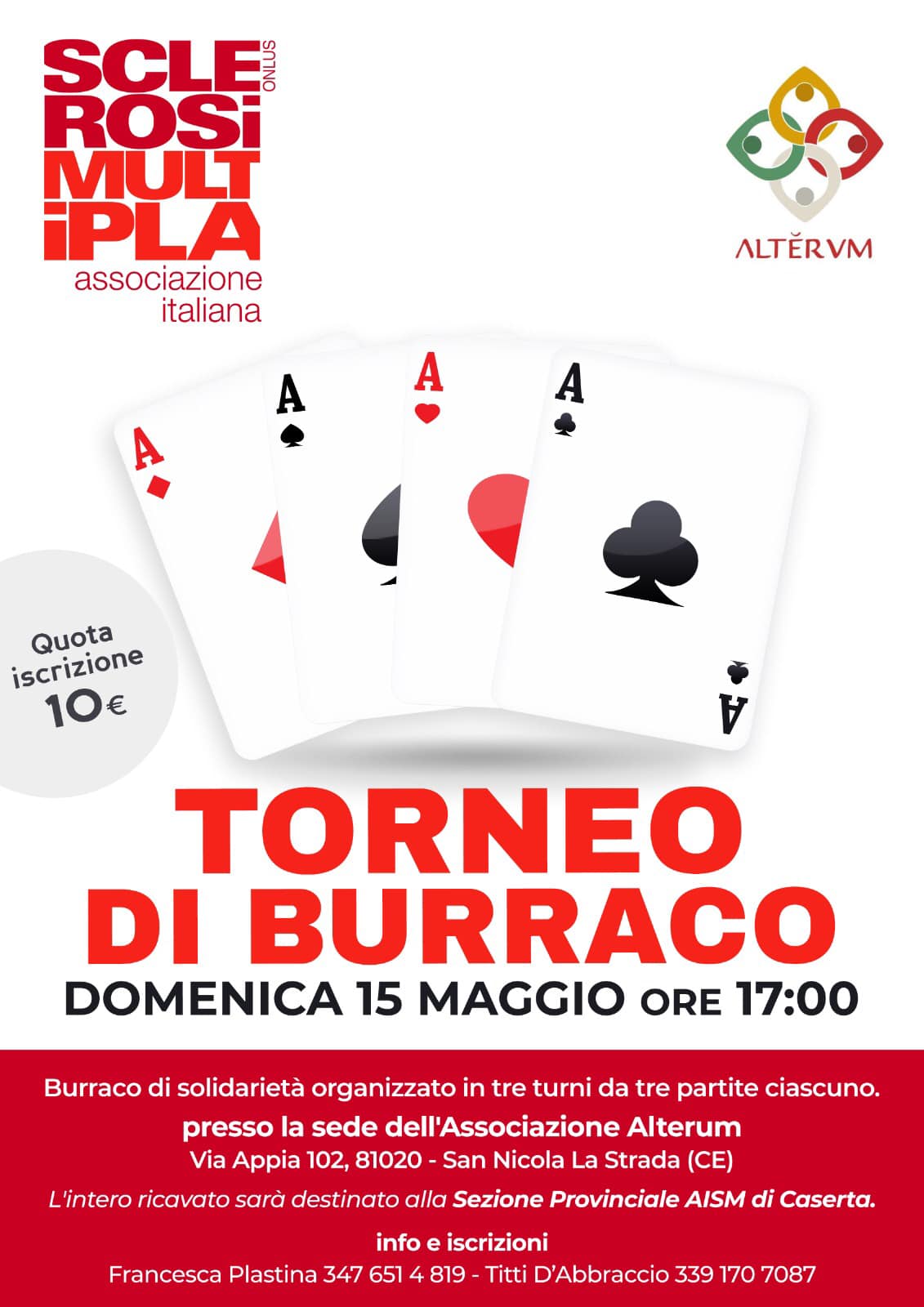 Domenica 15 maggio alle ore 17, presso i locali di Alterum, in via Appia 102, 81020, San Nicola La Strada (CE), si svolgerà un Torneo di Burraco di solidarietà. Tutto il ricavato andrà all’Associazione Sclerosi Multipla.