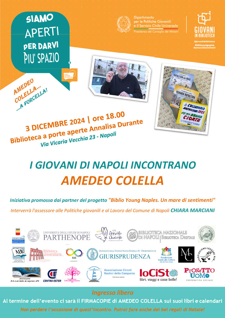 Lo scrittore ed umorista napoletano Amedeo Colella è stato invitato da 18 Enti della città ad incontrare i giovani per parlare di Napoli e del suo “mare di sentimenti”. L’iniziativa si inquadra nell’ambito del progetto “Biblio Young Naples. Un mare di sentimenti”, coordinato dalla Biblioteca dell’Università degli Studi di Napoli Parthenope, diretta da Rosa Maiello, attuato in collaborazione con 17 partner, tra i quali la biblioteca Annalisa Durante – promotrice dell’evento – e l’assessorato ai Giovani del Comune di Napoli guidato dall’assessore Chiara Marciani, che aprirà l’incontro.