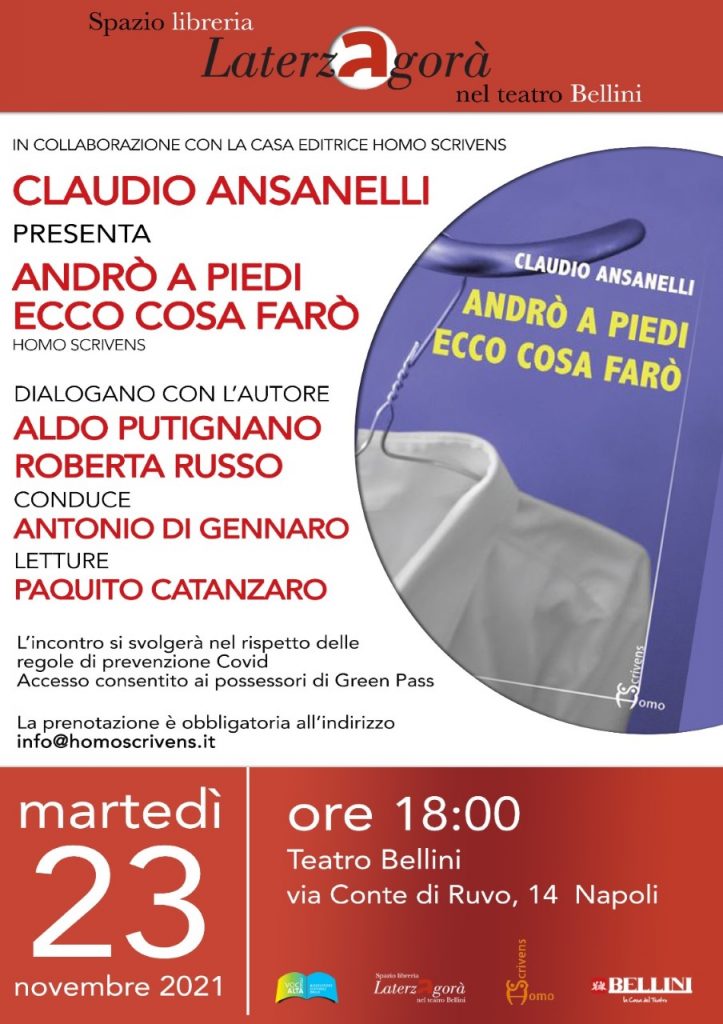 Homo Scrivens, in collaborazione con lo spazio libreria Laterzagorà, è lieta di invitarvi alla prima presentazione di Andrò a piedi, ecco cosa farò, il nuovo libro di Claudio Ansanelli, presso il foyer del Teatro Bellini (via Conte di Ruvo, 14 – Napoli).