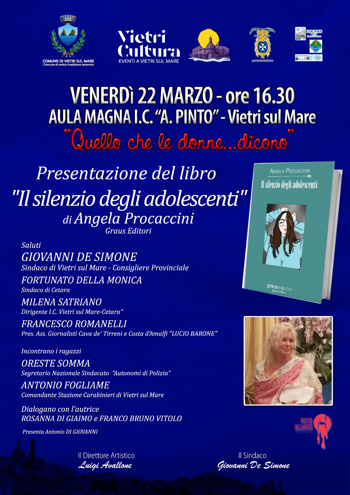 Sara’la scrittrice Angela Procaccini, scrittrice,docente e madre della piccola e mai dimenticata Simonetta Lamberti, uccisa dalla mano assassina della camorra a Cava de’ Tirreni 29 maggio 1982, presentare il suo libro “Il silenzio degli adolescenti”( Graus ed.).Dopo i saluti istituzionali del sindaco di Vietri sul mare e consigliere provinciale Giovanni de Simone,del sindaco di Cetara Fortunato della Monica,del presidente dell’Associazione Giornalisti Cava de’ Tirreni –Costa d’Amalfi “Lucio Barone” e della dirigente scolastica Milena Satriano,che illustrerà la ricaduta didattica del percorso formativo iniziato all’inizio del 2024 , con il coinvolgimento degli alunni in questa manifestazione . A dialogare con la scrittrice saranno i giornalisti Rosanna Di Giaimo e Franco Bruno Vitolo. Durante la presentazione molto spazio sarà dato ai ragazzi,della scuola secondaria di primo grado dei plessi Vietri sul mare e di Cetara , che potranno confrontarsi con la scrittrice ,con il comandante della caserma dei Carabinieri di Vietri sul mare, Antonio Fogliame e con il segretario Nazionale del sindacato Autonomi della Polizia di stato Oreste Somma. La presentazione dell’evento è affidata al giornalista Antonio Di Giovanni ,ideatore della manifestazione.