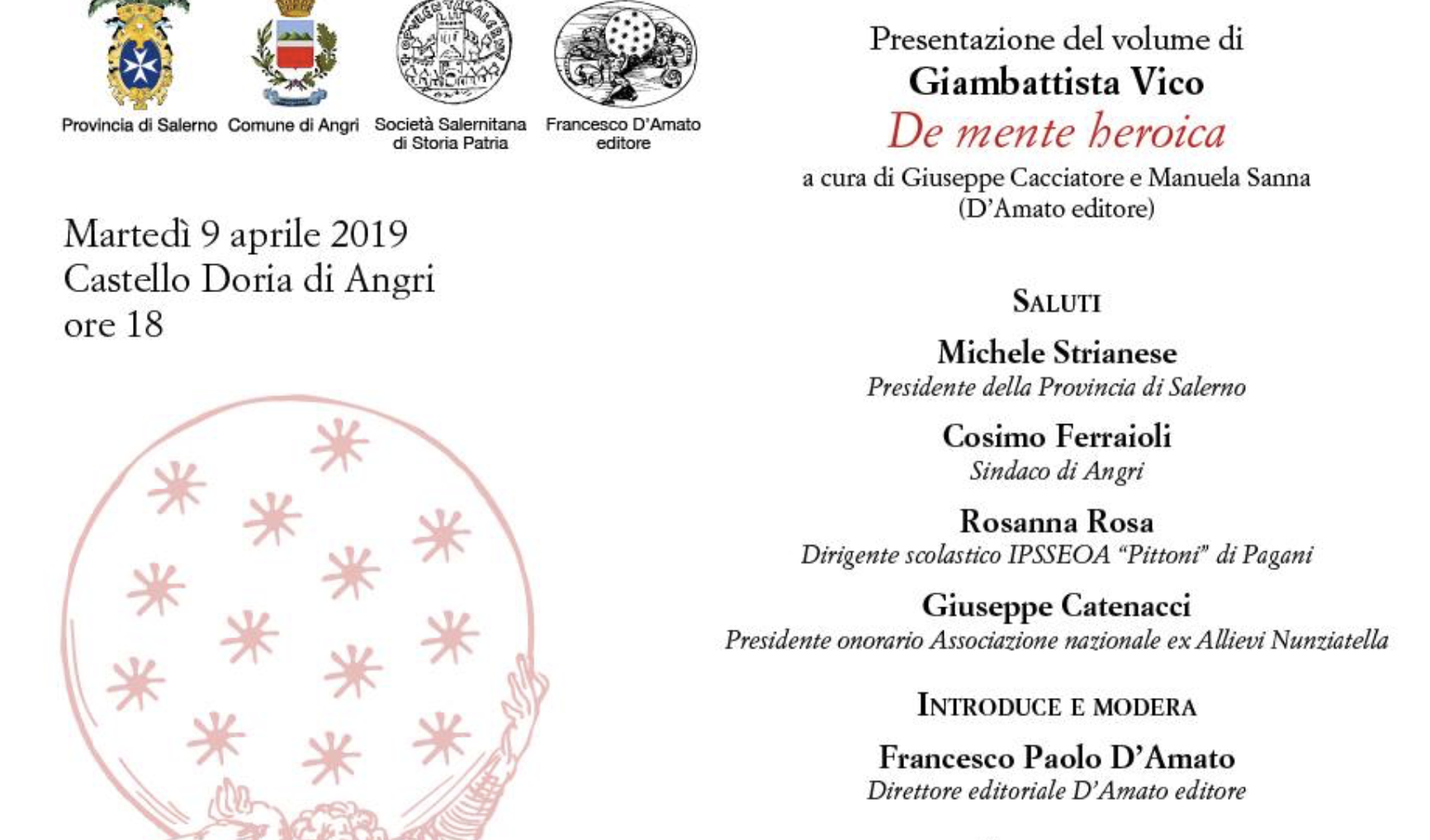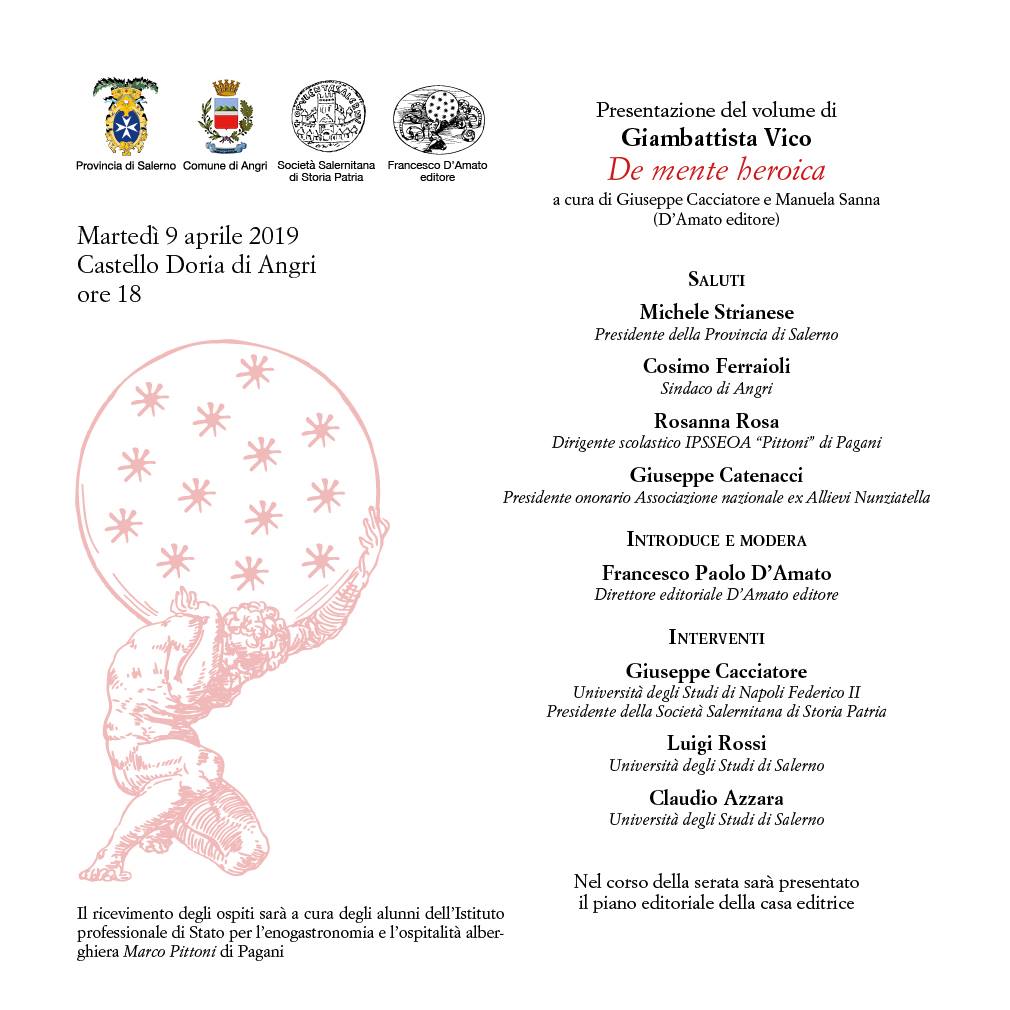 Martedì 9 aprile alle 18 ad Angri, al Castello Doria, presentazione del volume Giambattista Vico “De mente heroica”, curato dal filosofo Giuseppe Cacciatore e dalla ricercatrice Manuela Sanna (Francesco D’Amato editore).