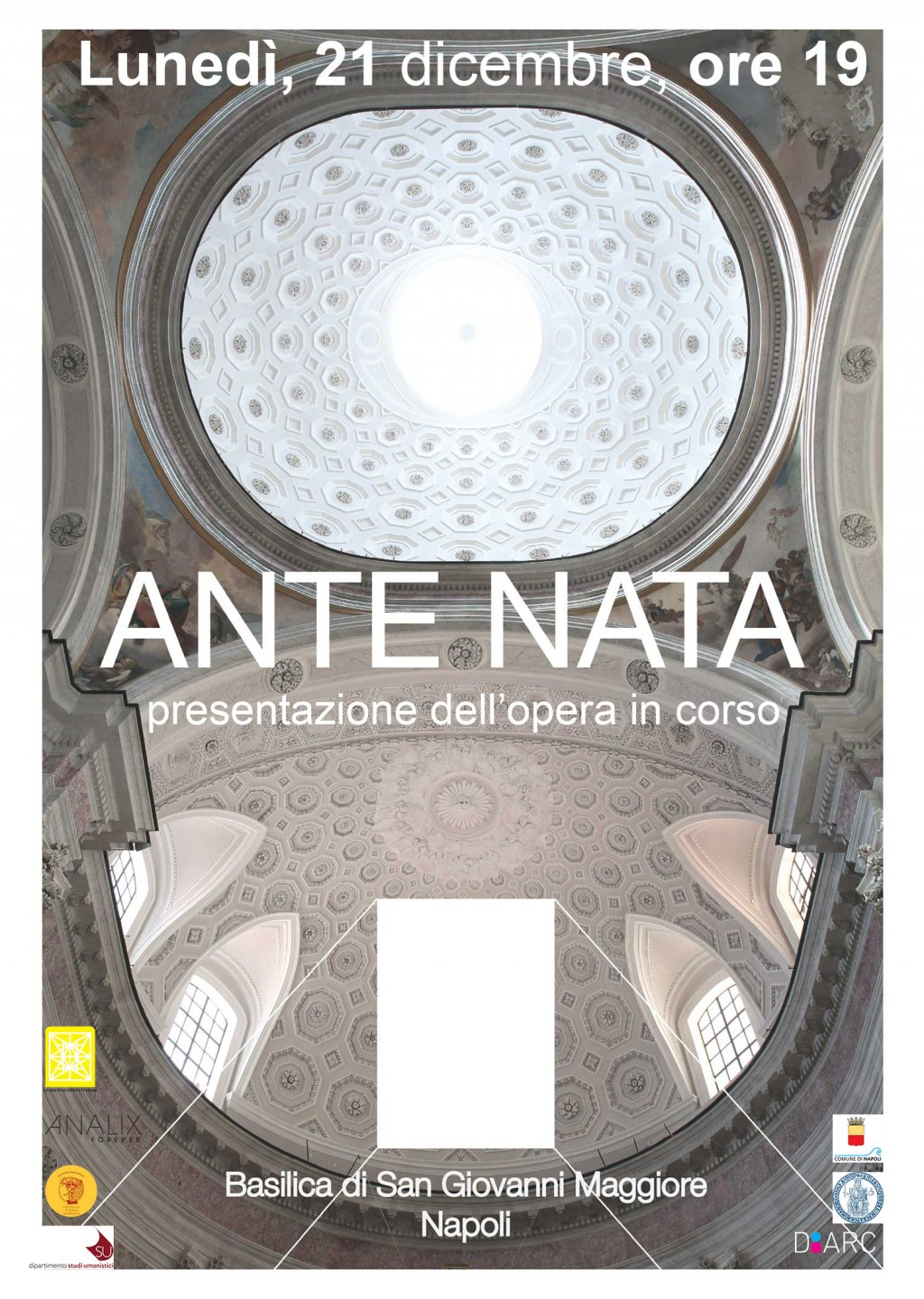 Patrocini di: Comune di Napoli; DIARC, dipartimento di Architettura dell’Università Federico II di Napoli; DSU, dipartimento di Studi Umanistici dell’Università Federico II di Napoli; Analix Forever Gallery-Ginevra; Scuola di Yoga integrale. Si ringraziano: Padre Salvatore Giuliano; la comunità di San Giovanni Maggiore e tutti i partecipanti; EmmedueService; Antiche Botteghe tessili di Piazza Mercato.