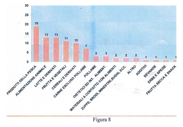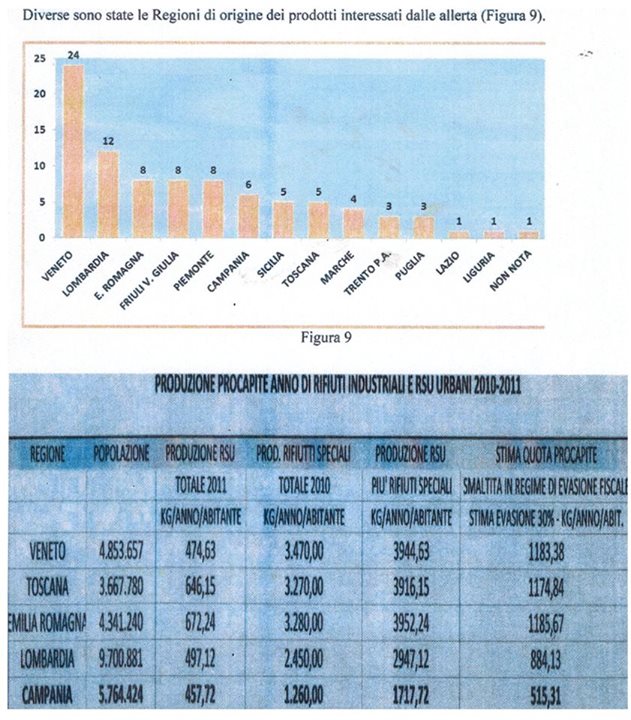 E le segnalazioni dei danni ai prodotti agroalimentari riportati in questi giorni dalla “Relazione sul sistema di allerta europeo” (figura 9) attestano senza alcun dubbio che la Campania viene molto dopo in termini di segnalazioni ricevute di prodotti inquinati rispetto a tutte le regioni industrializzate del nord : Veneto, Lombardia, Emilia Romagna. Si dimostra una perfetta sovrapposizione tra segnalazioni effettuate di danno al prodotto agroalimentare e produzione pro capite/anno non già di rifiuti urbani, ma, come ovvio, di rifiuti speciali, industriali, tossici e consumo di pesticidi (tabella 1). Chi ha la maggiore produzione industriale pro capite e il maggiore uso di pesticidi mostra il maggior rischio e numero di segnalazioni di danno agroalimentare. E tutto quello che viene illegalmente sversato nella terra o sulla terra (roghi tossici) finisce nell’acqua e nel mare, come appunto confermano le segnalazioni ricevute ed il prof Limone dello zooprofilattico (figure 3 e 4).
