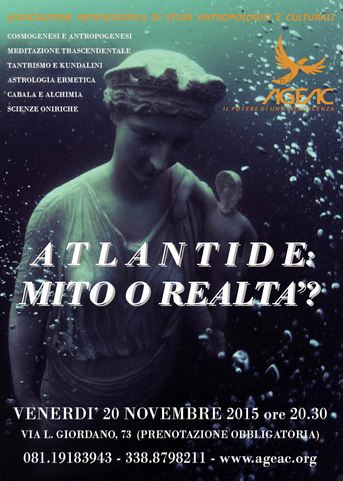 A tutte queste domande si proverà a rispondere nel simposio del prossimo 20 novembre, intitolato “ATLANTIDE: MITO O REALTA’?”, che si terrà in Via Luca Giordano 73, al Vomero (prenotazione obbligatoria (TEL. 081.19183943 – 338.8798211) organizzato da AGEAC – ASSOCIAZIONE GEOFILOSOFICA DI STUDI ANTROPOLOGICI E CULTURALI – che intende portare l’attenzione del ricercatore fuori da ogni luogo comune o discorso stereotipato, sorprendendo con documentate rivelazioni storiche, sempre ignorate, e per gli stimoli sapienziali che verranno proposti.