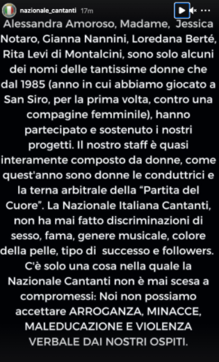 “La Nazionale Italiana Cantanti, non ha mai fatto discriminazioni, di sesso, fama, genere musicale, colore della pelle, tipo di successo, e followers. C’è solo una cosa con nella quale la Nazionale Cantanti non è mai scesa a compromessi: Noi non possiamo accettare ARROGANZA, MINACCE, MALEDUCAZIONE E VIOLENZA VERBALE DAI NOSTRI OSPITI”.