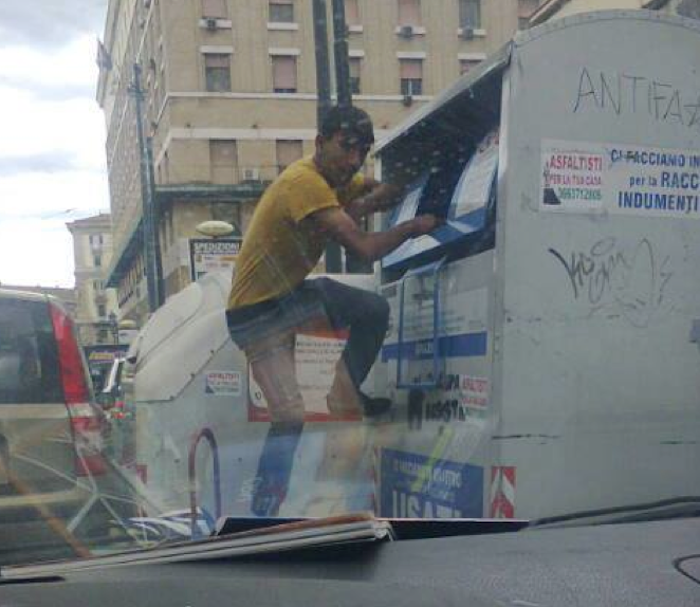 Scena surreale questa mattina in via Medina: un giovane rom, indisturbato, si tuffa a capofitto in uno dei contenitori per la raccolta differenziata degli abiti usati