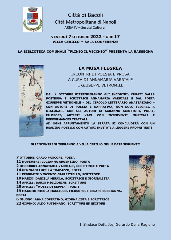 Venerdì 7 ottobre, nella Biblioteca Comunale “Plinio il Vecchio” di Bacoli prenderà il via la Rassegna Letteraria “La Musa Flegrea” 2022/2023. Ideata e condotta dalla scrittrice Annamaria Varriale, con la collaborazione di Giuseppe Vetromile. La manifestazione si avvale del contributo sinergico della biblioteca comunale di Bacoli.