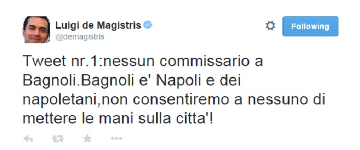 “Nessun commissario a Bagnoli. Bagnoli è Napoli e dei napoletani, non consentiremo a nessuno di mettere le mani sulla città!”. Un concetto diretto e chiaro che il primo cittadino partenopeo rilascia in un messaggio su Twitter. Aprendo un’ulteriore pagina in merito alla delicata vicenda. O, forse, sarebbe meglio dire, chiudendola.