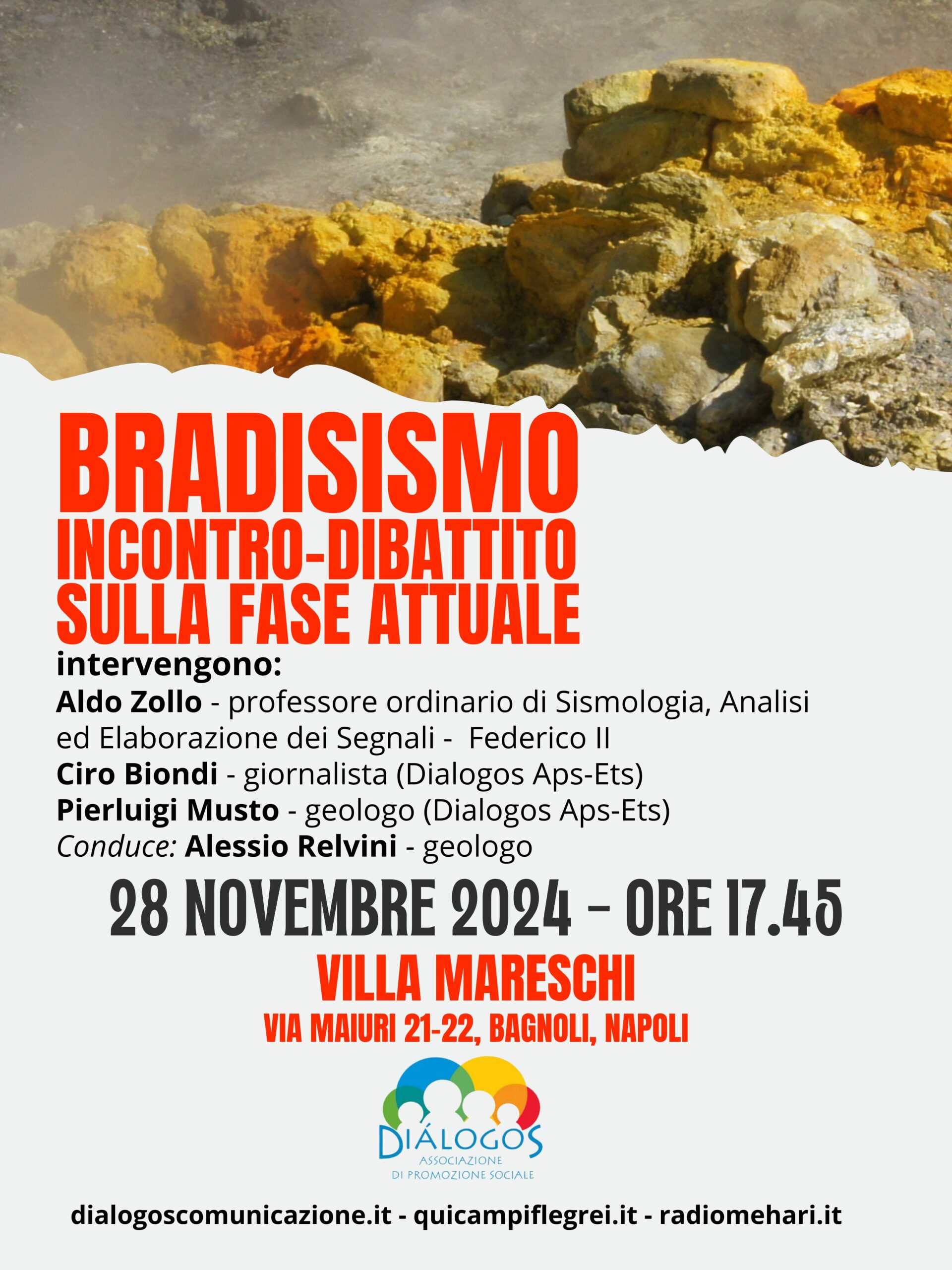 “Bradisismo: incontro dibattito sulla fase attuale” è il titolo dell’incontro pubblico promosso dall’associazione Dialogos. Intervengono: Aldo Zollo (professore ordinario di Sismologia, Analisi ed Elaborazione dei Segnali – Federico II), Ciro Biondi (giornalista e presidente di Dialogos Aps-Ets), Pierluigi Musto (geologo e membro dell’associazione Dialogos Aps-Ets). Conduce: Alessio Relvini (geologo). L’evento si svolge giovedì 28 novembre 2024 alle ore 17.45 a Villa Mareschi, in via Maiuri 21-22 a Bagnoli, Napoli.