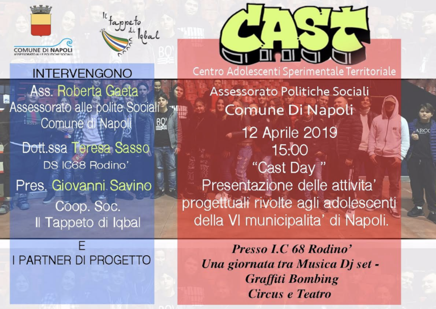 Partita oggi la terza annualità del progetto “C.A.S.T Centro Adolescenti Sperimentale Territoriale” promosso dall’Assessorato alle Politiche Sociali del Comune di Napoli e realizzato dalla cooperativa sociale Il Tappeto di Iqbal: l’appuntamento è presso i locali dell’Istituto Compresivo 68° Rodino in via Mastellone (quartiere Barra), dalle ore 15 alle ore 18.