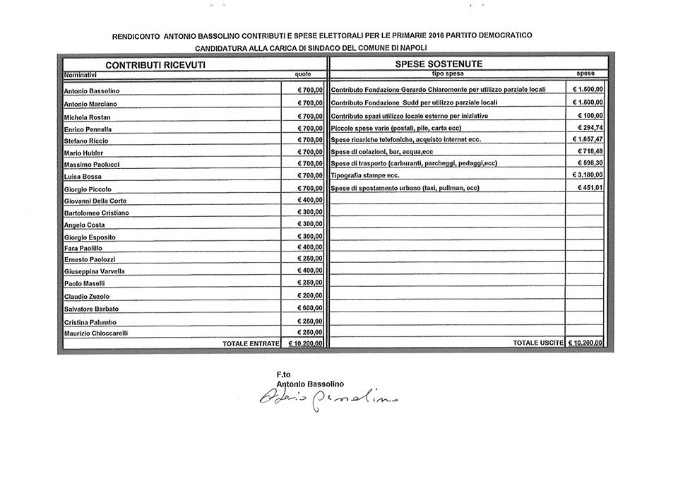 Antonio Bassolino, attraverso i suoi profili social, ha reso pubblico il rendiconto dei contributi e delle spese per le primarie per la candidatura a sindaco di Napoli. In totale si tratta di 10.200 euro, “un terzo del tetto massimo di 30.000 euro”.