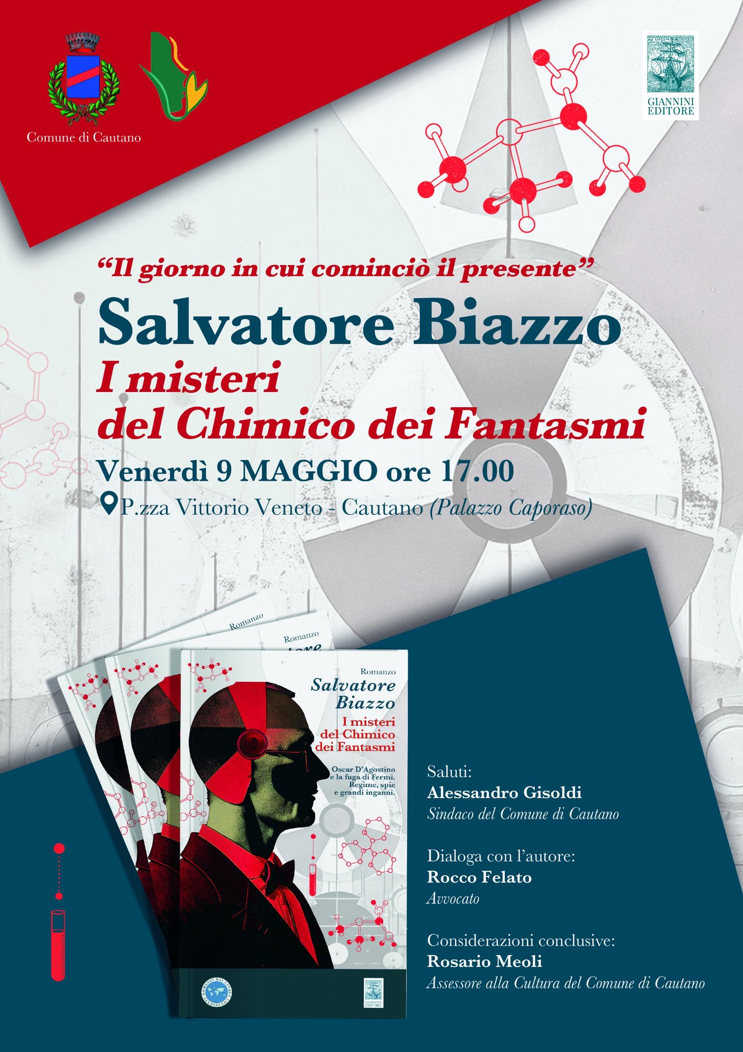 Prima presentazione per il libro “I misteri del Chimico dei Fantasmi” di Salvatore Biazzo pubblicato dalla Giannini Editore, nella collana Romanzi dai Cinque Continenti. Appuntamento venerdì 9 maggio alle ore 17 presso Palazzo Caporaso, p.zza Vittorio Veneto Cautano (Bn). Dopo i saluti del sindaco Alessandro Gisoldi, dialogherà con l’autore Rocco Felato. Concluderà la presentazione l’assessore alla Cultura del Comune di Cautano Rosario Meoli.