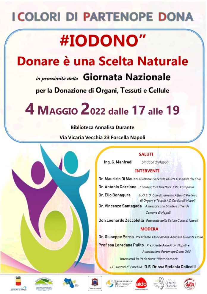 “IO DONO” è il titolo dell’iniziativa che si terrà mercoledi 4 maggio p.v. alle ore 17 presso la Biblioteca Annalisa Durante, dando il via al programma di informazione e sensibilizzazione 2022 sulla donazione di organi, tessuti e cellule, promosso dalla Sezione napoletana dell’AIDO – Associazione Italiana Donatori Organi e dall’OdVPartenope Donacon il patrocinio del Comune di Napoli e la collaborazione di numerosi Enti, tra i quali l’Azienda Ospedaliera dei Colli, il Centro Regionale Trapianti della Campania, la Diocesi di Napoli, l’APS Annalisa Durante e l’I.C. Adelaide Ristori.
