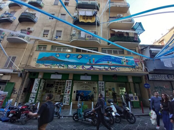 Da qualche giorno, in via Vicaria Vecchia 23, campeggia sulla parete di ingresso della biblioteca un lungo striscione intitolato “Napoli nella storia”, che raffigura il tricolore all’interno di libri fuoriusciti dalla bocca festosa del Vesuvio sparsi sul mare del magnifico golfo partenopeo.