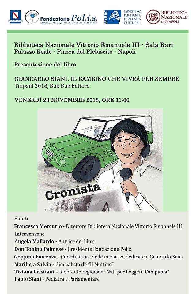 Il libro “Giancarlo Siani, il bambino che vivrà per sempre” è uno strumento didattico di educazione alla cittadinanza consapevole e alla legalità, rivolto ai bambini delle scuole primarie e secondarie di primo grado (età 8/12 anni). Si avvale della prefazione di Paolo Siani, fratello di Giancarlo, parlamentare alla Camera dei Deputati e già presidente della Fondazione Polis, e della postfazione di Pino Imperatore, giornalista e scrittore che, nel 1995, fu tra i promotori dell’intitolazione a Giancarlo Siani della scuola di Mugnano di Napoli dove l’autrice insegna dal 1991.