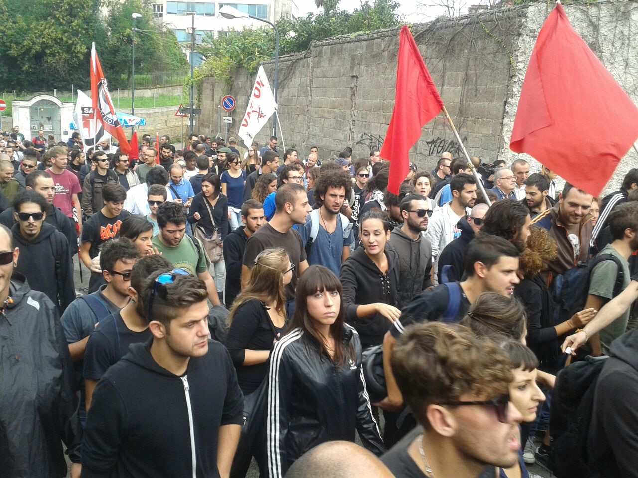 Il corteo raggiunge in questi istanti l’ospedale CTO. Siamo al limite della zona calda. “La ricchezza c’è ma si accumula nelle mani di pochi” dice uno degli speaker con l’altoparlante. La manifestazione di oggi non sarà un evento isolato: gli organizzatori annunciano nuove giornate di mobilitazione, previste per il 10 e il 14 ottobre. In particolare il 10 ottobre è previsto il primo corteo studentesco contro Renzi e Giannini. Nei pressi del CTO scatta anche la nuova rivendicazione: quella del diritto alla salute, anche questo negato ai cittadini dalla supremazia dei poteri forti. Intanto a “scortare” il corteo arriva un elicottero delle forze dell’ordine, che sorvolerà l’area e accompagnerà i manifestanti da questo punto in poi fino al raggiungimento della Reggia di Capodimonte.