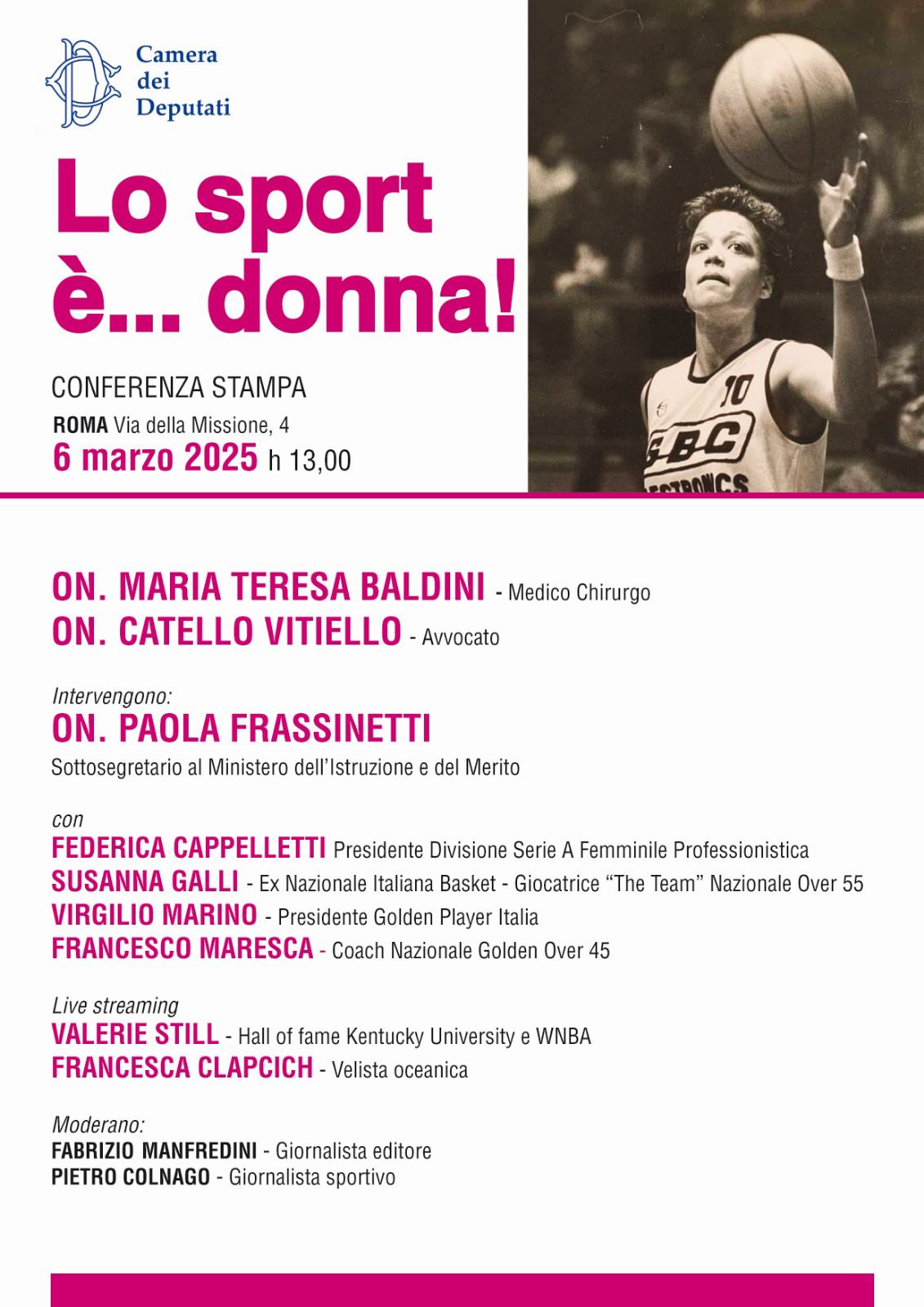 Intervengono l’on. Maria Teresa Baldini, Medico Chirurgo, l’on. Catello Vitiello, avvocato, l’on Paola Frassinetti, Sottosegretario al Ministero dell’Istruzione e del Merito, Federica Cappelletti, Presidente Divisione Serie A Femminile Professionistica, Susanna Galli, Ex Nazionale Italiana Basket, Giocatrice “The Team” Nazionale Over 55, Virgilio Marino, Presidente Golden Player Italia, Francesco Maresca, Coach Nazionale Golden Over 45, Valerie Still, Hall of fame Kentucky University e Wnba Francesc Clapcich, Velista.