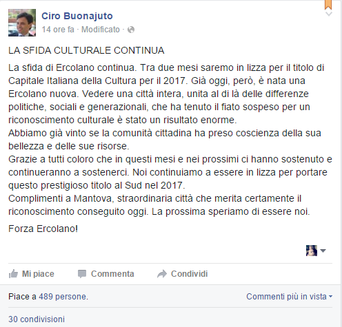Come riportato dall’Ansa, in lizza c’era anche Ercolano (Napoli) il cui sindaco, Ciro Buonajuto, ha fatto i complimenti alla vincitrice e lasciato un commento sul suo profilo Facebook ufficiale: “Noi ci auguriamo che il 25 gennaio saremo selezionati come capitale per il 2017. Coinvolgere i cittadini è stata una vittoria“.