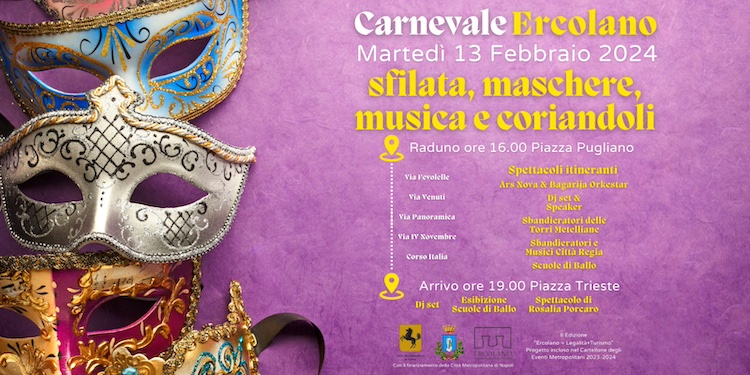Seconda edizione per il progetto Ercolano = Legalità + Turismo  che ha come sottotitolo “Con l’amore non si scherza”. Con parata, sfilata in maschera, sbandieratori, carro sparacoriandoli e bus dei supereroi, musica popolare, comicità e scuole di ballo cittadine si festeggerà il Carnevale 2024 nelle vie della Città degli Scavi.