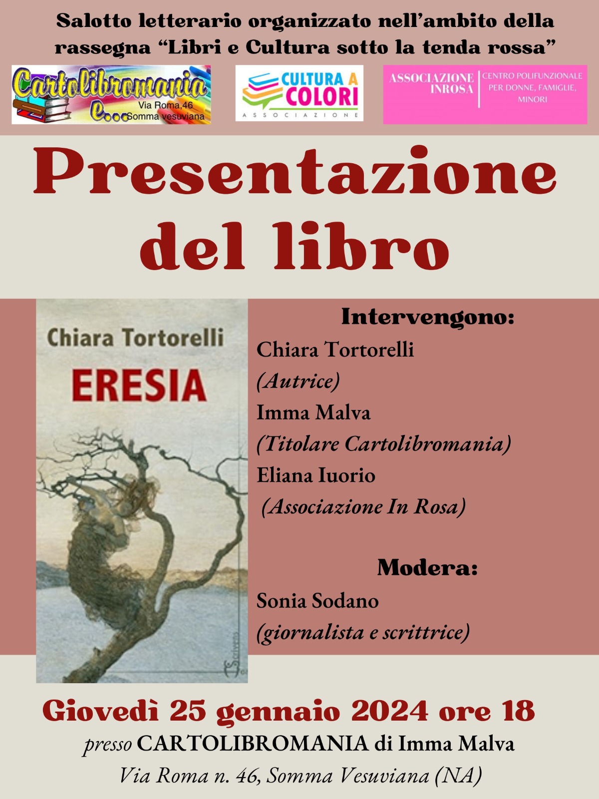 Gli eventi, che rientrano nell’ambito della rassegna letteraria “Libri e Cultura sotto la tenda rossa”, sono organizzati in collaborazione con l’Associazione In Rosa di San Giuseppe Vesuviano e la testata giornalistica nazionale, Cultura A Colori.