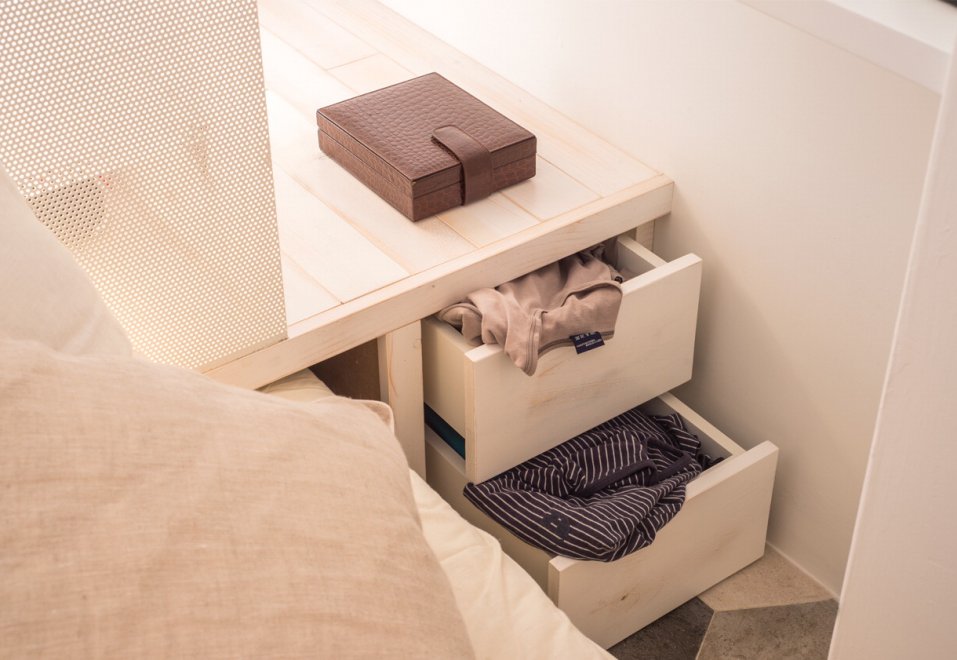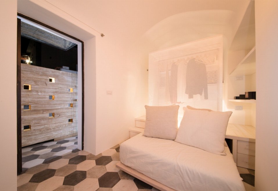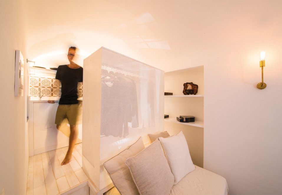 “L’elemento protagonista dello spazio è un armadio scenografico, in rete microforata, appositamente illuminato. Quasi una scatola magica, dove gli abiti diventano istallazione. Tutto ruota attorno a questo elemento: se da un lato filtra la vista della cucina, generando un effetto di vedo e non vedo, dall’altro diventa testata del letto o spalliera del divano. Quanto al letto – spiega Cortese – scorre al di sotto di una pedana in legno, in modo che di giorno venga utilizzato come divano e la notte si trasformi in letto”. Idee innovative e creative per vivere in soli 11 metri quadri, una casa in miniatura che non è però la più piccola esistente: il record italiano lo detiene un monolocale di Roma di 7 metri quadri nelle vicinanze dal Pantheon.