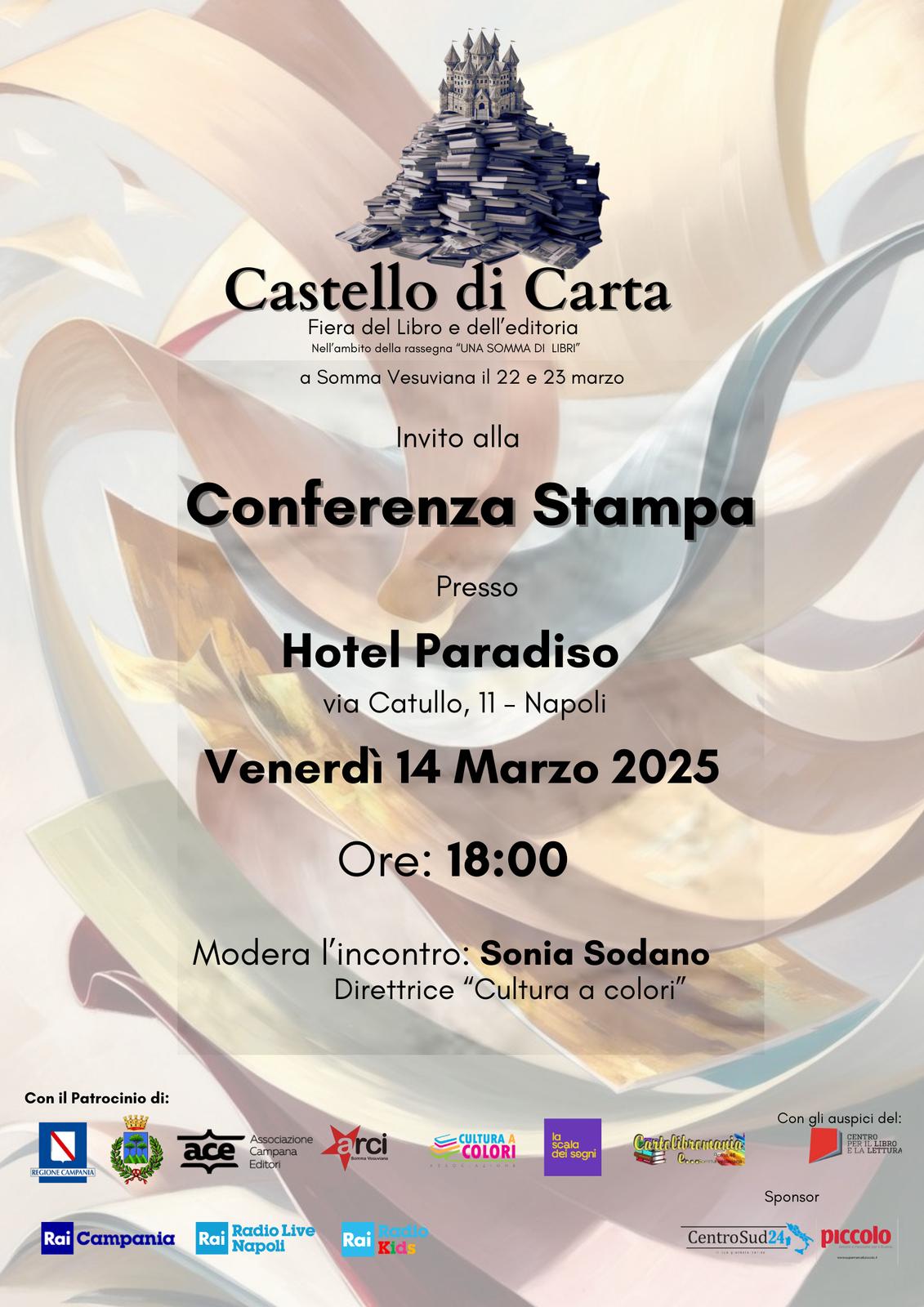 Si terrà venerdì 14 marzo alle ore 18:00 nella sala meeting del BW Signature Collection Hotel Paradiso (via Catullo, n 11 – Napoli), la conferenza stampa di presentazione della Fiera del Libro e dell’Editoria “Castello di Carta”, kermesse letteraria che si svolge sotto gli auspici del Centro per il Libro e la Lettura e si inserisce nell’ambito della rassegna “Una Somma di Libri” e che gode del patrocinio della Regione Campania, del Comune di Somma Vesuviana e dell’Associazione Campana Editori, nonché del patrocinio di Rai Campania e dell’autorizzazione delle media partnership di Rai Radio Live Napoli e Rai Radio Kids. La manifestazione, che si propone come un punto di riferimento per gli appassionati di libri e cultura, creando un’occasione di incontro e confronto tra autori, editori e lettori di tutte le età, è organizzata da CartolibroMania Malva, La Scala dei Sogni, Cultura a Colori e si avvale del supporto della giornalista Federica Flocco e del sostegno dell’Arci di Somma Vesuviana e si terrà sabato 22 e domenica 23 marzo presso il suggestivo Castello di Lucrezia D’Alagno, noto anche come l’ex Castello di Totò, a Somma Vesuviana. Durante la conferenza stampa, verranno presentate le numerose case editrici, librerie e organizzazioni del territorio che prenderanno parte alla manifestazione. Sarà inoltre illustrato il ricco programma che animerà le due giornate della fiera, tra presentazioni di libri, firma copie ed eventi pensati per valorizzare il mondo dell’editoria. Grande attenzione sarà riservata anche ai più piccoli con l’“Area Kids”, messo a disposizione da Cartolibromania e La Scala dei sogni, uno spazio interamente dedicato ai bambini, attrezzato per accoglierli in un ambiente stimolante e sicuro. All’interno di questa area si svolgeranno letture ad alta voce, laboratori di scrittura e presentazioni di libri pensati appositamente per loro.Per ulteriori informazioni, sarà possibile rivolgersi agli organizzatori durante la conferenza stampa.