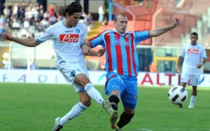 Un tiro dai 30 metri di Cavani non impensierisce Andujar: Pandev non raccoglie la respinta, anticipato da Spolli. Un primo tempo incolore, scialbo, insipido. Partenopei macchinosi, lenti, imprecisi. Anziché dirigere le operazioni, impostare e comandare il gioco, subiscono le sortite dei catanesi.