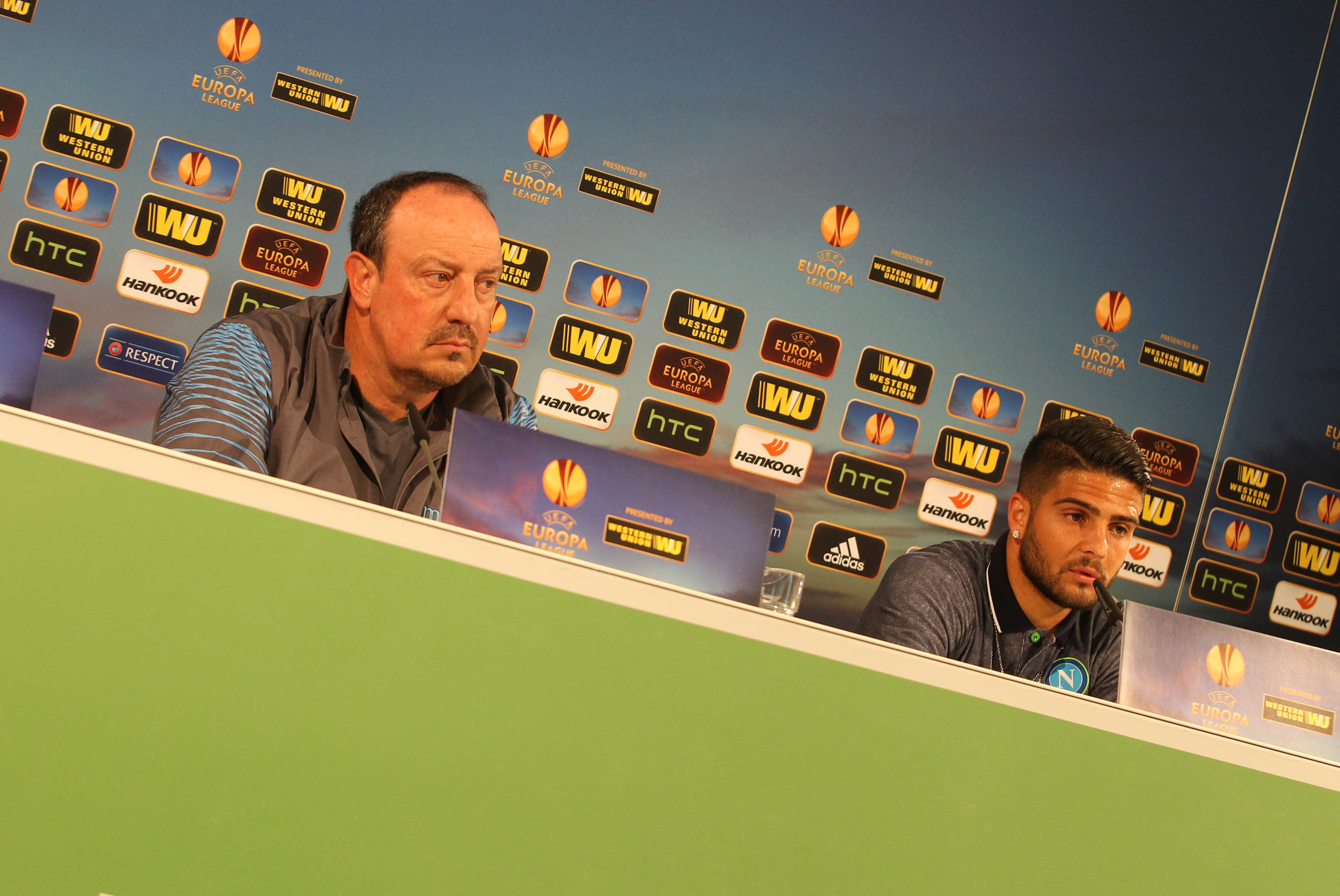 Benitez e Maggio in conferenza stampa alla vigilia di Dinamo Mosca-Napoli. Azzurri all'assalto dei quarti dopo il 3-1 dell'andata al San Paolo.